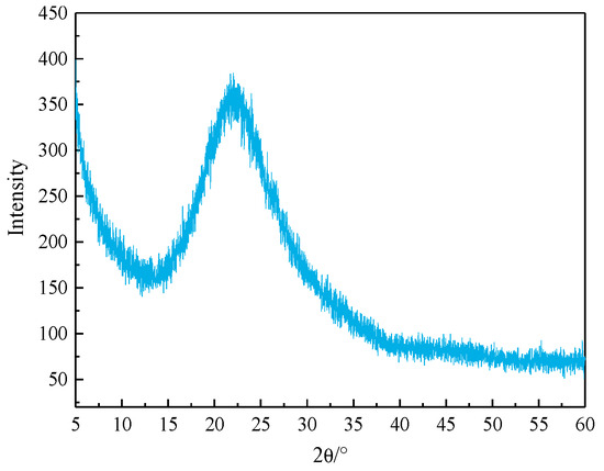 The cement paste was prepared by P·I 42.5 Portland cement, which was produced by China United Cement Group Co., Ltd, and it was recorded as P. The physical and mechanical properties of cement are shown in Table 1. RHA was prepared according to references as follows [3,21]: rice husks were crushed and finely ground into rice husk powder. A dilute hydrochloric acid solution with a mass concentration of 2.5% was used as a pretreatment agent to soak the rice husk powder at a solid–liquid ratio of 1:10 for 1 h, and the rice husk powder was stirred once every 20 min to ensure thorough acidification. After the pretreatment, the acidified rice husk powder was filtered through an 80-mesh stainless steel sieve, washed, and filtered with clean water 3 times. The acidified rice husk powder was dried in an oven until it formed blocks, then crushed into powder using a crusher. Subsequently, a crucible containing rice husk powder was placed in a muffle furnace for heating, raised from room temperature to 600 °C for 1 h, and maintained for 0.5 h, then the white RHA would be obtained by repeated calcination 3 times, recorded as R. The combustion program and preparation process are shown in Figure 1, and the XRD pattern of RHA is shown in Figure 2. The density of RHA is measured to be 2.21 g/cm3.