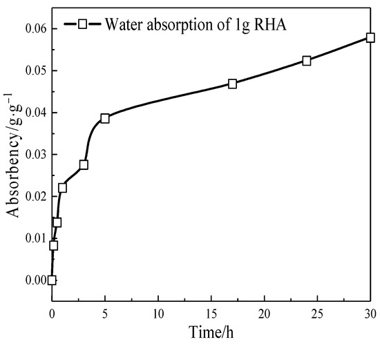 In order to verify the porous structural characteristics of RHA, the water absorption characteristics of RHA were tested according to the method in references [17,22]. Specifically, the RHA was dried at 110 ± 5 °C for 48 h until a constant weight was reached. A certain quantity of RHA was taken to lay a thin layer in a glass petri dish, which was then placed on an electronic scale and put inside a constant temperature and humidity chamber set at 20 °C and 100% RH. Changes in sample mass with time were recorded, as shown in Figure 5. The specific surface area of RHA was measured to be 207.8 × 103 m2/kg using BET-N2 adsorption. The pore size distribution of RHA was calculated using the BJH method, as shown in Figure 6. Based on the calculation of the cumulative pore volume per unit mass, the porosity of RHA was 67.04%.