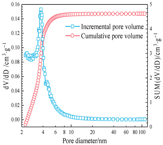 The specific surface area measured by the N2 adsorption method typically represents the internal surface area for porous cementitious materials and the external surface area for powder materials. Due to the porous structure of RHA providing more internal surfaces, the measured specific surface area is the sum of the internal and external surface areas. Therefore, the specific surface area of RHA is much greater than that of cement. It can be observed that the micropores of RHA are mainly concentrated in the range of 2–20 nm, as shown in Figure 6.