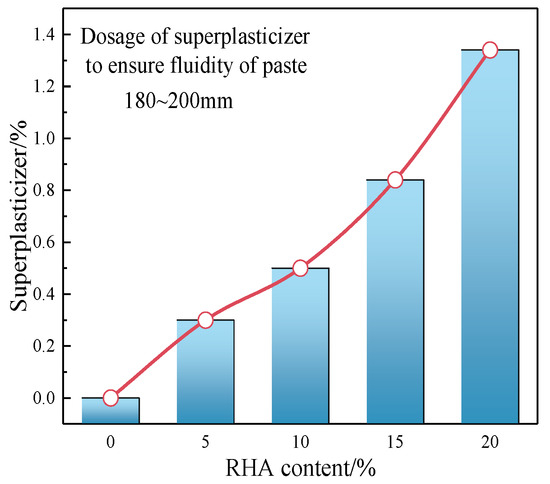 The cement–RHA composite pastes were prepared by using RHA as a substitution for cement in the experimental mix proportions. The water–binder ratio is 0.4, and the RHA replacement rates are 0%, 5%, 10%, 15%, and 20%, respectively, recorded as PC, PR5, PR10, PR15, and PR20. Due to the porous characteristics and high-water storage function of RHA particles, a large dosage of superplasticizer needs to be added when preparing cement composite pastes, as shown in Figure 7. The dosage of superplasticizer with 180–200 mm slump flow of pastes increases with the content of RHA. The more RHA is added, the greater the increase in the superplasticizer dosage. In order to avoid the impact of superplasticizer on the early hydration of cement and ensure the stir-ability and flowability of the pastes, the same dosage (0.4%) can be uniformly used for 5%, 10%, and 15% RHA. The use of 0.4% superplasticizer for 20% RHA pastes cannot be stirred and formed, and excessive superplasticizer may mislead the analysis of hydration heat data. Therefore, the RHA contents for 0%, 5%, 10%, and 15% are selected for the calorimetric test.