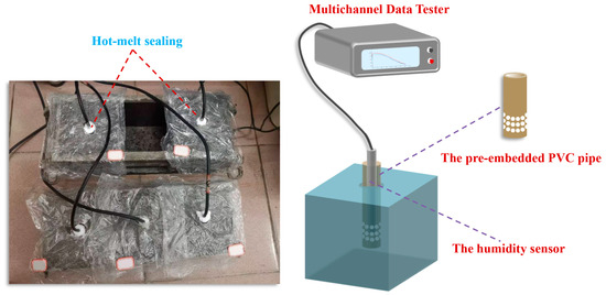 In order to understand the water-release effect of RHA, the RH within the paste was measured during the hydration process [24]. A PVC pipe was used to reserve a hole with a diameter of 20 mm and a depth of 80 mm in the center of a 10 cm × 10 cm × 10 cm sample. Multiple pre-drilled holes for the PVC pipe at the central position of the sample were made at a depth of 50 mm (refilled the PVC pipe with filler during mortar forming), which aimed to ensure proper moisture exchange between the sample and the pore, and effectively avoid inaccurate humidity data caused by the sensor contacting with the pastes. To prevent the humidity inside the hole from being affected by the external environment, the reserved hole was sealed with hot-melt adhesive, which also fixed the sensor in place. The outer surface of the sample was sealed with plastic film. The ambient temperature was maintained at 20 ± 2 °C, and the internal RH was recorded every 5 min by using a multichannel data tester, as shown in Figure 8.