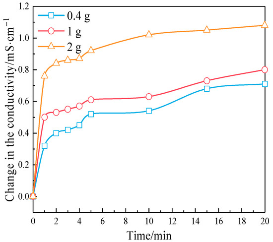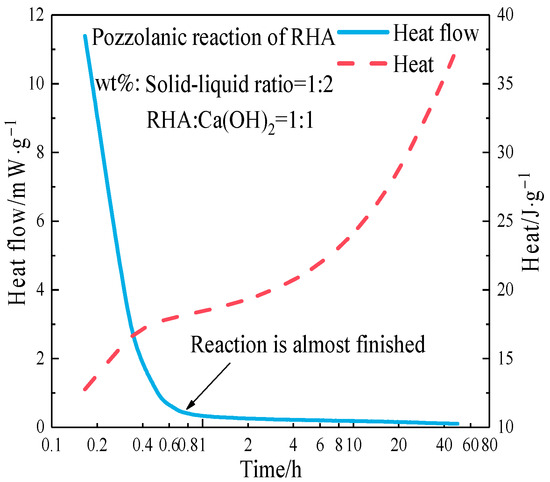 Figure 9 shows the exothermic curve of the pozzolanic reaction of RHA. The exothermic reaction rate of RHA decreases rapidly with time and gradually stabilizes after approximately 36 min. The initial reaction already reaches the peak exothermic value of the pozzolanic reaction, which indicates that RHA can react rapidly with Ca(OH)2 within a short period. The reactivity of RHA was determined by the conductivity method of saturated Ca(OH)2 solution [25]. Figure 10 shows the effect of different RHA masses on the conductivity variation of the saturated Ca(OH)2 solution within 0 to 20 min.