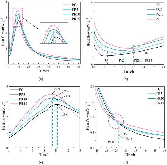 Hydration heat flow (a) 0–72 h, (b) 0.5–4 h, (c) 2–14 h, and (d) 14–50 h of cement–RHA pastes.