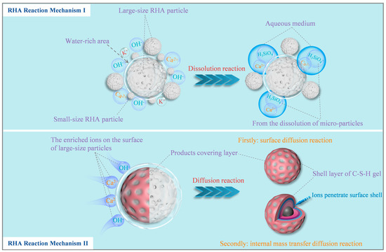 Based on the physicochemical properties of RHA particles, it can be clarified that there are two reaction mechanisms of RHA in the cement system [26], as shown in Figure 12, which can fully analyze the influence of RHA on the hydration heat of the composite pastes. Reaction mechanism I: Si-O bonds in RHA are disconnected by OH− ions [27], and hydrolyzed to form the H3SiO4− ions [28,29], as shown in Equation (3) [30]. The Ca2+ ions from the cement hydration react with the H3SiO4− ions to produce the C-S-H gel. Reaction mechanism II: the surface of partially slow-dissolving RHA particles will be enriched with a large amount of Ca2+ ions and OH− ions, which will react with SiO2 molecules to form a C-S-H gel layer surrounding the particle surface as the nucleation site [31]. With the processing of hydration, the ions will gradually penetrate through the surface shell and mass transfer to the interior of the particles and continue to the diffusion reaction.