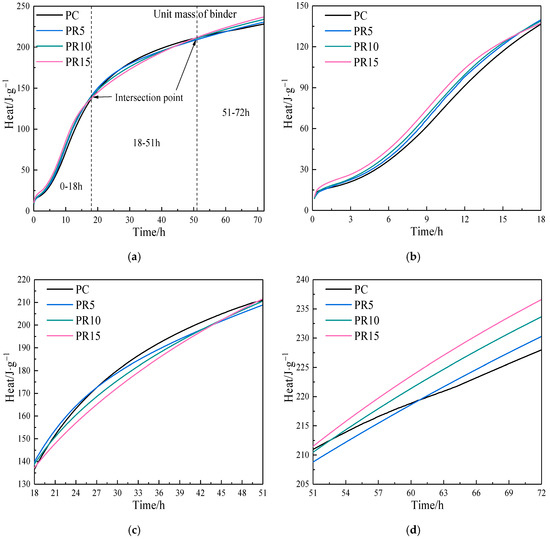 The cumulative heat (a) unit mass of binder, (b) 0–18 h, (c) 18–51 h, and (d) 51–72 h of cement–RHA pastes.