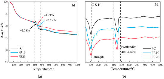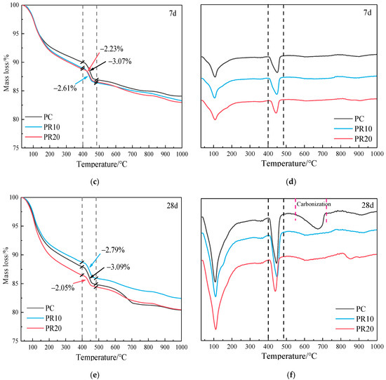 The TG-DTG curves can be divided into two stages [38]: the first stage is the decomposition of hydration products such as C-S-H gels, hydrated calcium aluminate, and AFm phase from room temperature to 300 °C. The second stage is the decomposition of Ca(OH)2 and carbonates [39]. The TG-DTG curves of cement–RHA pastes at different ages are shown in Figure 14. The decomposition temperature of Ca(OH)2 typically ranges from 400 to 550 °C. However, due to the variations in testing parameters and conditions, the DTG curve should be based on actual testing. From the DTG curve, it can be determined that the decomposition of Ca(OH)2 starts at 400 °C and ends at 484 °C. Therefore, 400–484 °C is selected as the temperature range for calculating the Ca(OH)2 content. The main mass variation in the DTG curve is the loss of H2O below 550 °C.