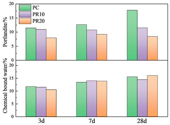 From Figure 15, it can be seen that the Ca(OH)2 content of PR10 and PR20 is lower than that of PC at all ages, and the reduction in Ca(OH)2 content increases with age. The chemically bound water shows different trends. At the age of 3 d, the increase of RHA significantly reduces the Ca(OH)2 content, and the chemical-bound water decreases with RHA. At the age of 7 d, the Ca(OH)2 content in PR20 shows a slight increase compared to 3 d. With a higher RHA content, the effective water–cement ratio decreases due to the water absorption characteristic, which leads to a decrease in the hydration degree at 3 d. With the progress of the age (3–7 d), a higher RHA content shows a more significant internal curing effect and releases more water, which promotes cement hydration and produces more Ca(OH)2. The Ca(OH)₂ content in PR10 at 7 d is slightly lower compared to 3 d, and there is little change in Ca(OH)2 content at 7–28 d. The chemically bound water increases and exceeds that of PC at 3–7 d, while the change is minor at 7–28 d. This indicates that the 10% RHA consumes Ca(OH)2 through the pozzolanic reaction in the early stage and improves the hydration degree. However, PR20 shows more significant Ca(OH)₂ consumption and hydration promotion from 7 to 28 d. Comparative analysis shows that an appropriate amount of RHA mainly consumes Ca(OH)2 and improves hydration in the early stage by the pozzolanic reactions. An excessive amount of RHA mainly shows the internal curing effect and pozzolanic reaction, then promotes hydration of the cementitious system in the later stage.