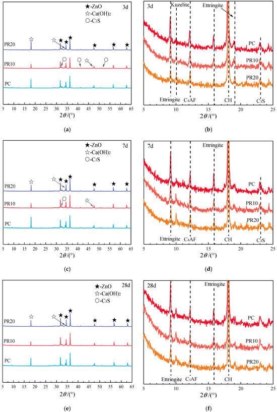 The XRD patterns (a,b) 3 d, (c,d) 7 d, and (e,f) 28 d of cementitious materials at different ages.