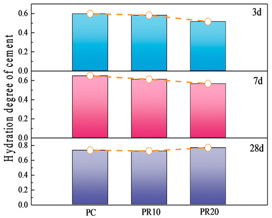 It can be seen from Table 6 that the higher the content of RHA is added, the more Ca(OH)2 is consumed. The hydration degree of C3S in samples blended with RHA is lower than that of PC at 3 d and 7 d, and the hydration degree of the cement single mine in PR10 is higher than that of PR20. This indicates that a higher RHA content affects the hydration of cement single mine in the early stage, which is consistent with the previous analysis. The increase of RHA enhances early water absorption, reducing the water available for cement hydration and thereby lowering the hydration degree of single mines. Additionally, the pozzolanic reaction consumes OH− and Ca2⁺ released from cement hydration, and H3SiO4⁻ produced by the hydrolysis of RHA particles will use the surface of cement particles as the nucleation position. This results in pozzolanic reaction products covering the cement particles, causing the cement to enter the diffusion-controlled reaction stage prematurely. The slowing down of cement leads to a decrease in the hydration degree of C3S. The Rietveld quantitative calculation was carried out on the cement single mines, and the cement hydration degree was calculated using Equation (2), as shown in Figure 18.