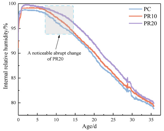 Figure 18 shows that the cement hydration degree in PR20 significantly increases at 28 d, which is higher than that of other samples. This indicates that more RHA produces water-release at 7–28 d, which facilitates more cement hydration. The Ca(OH)2 content obtained by XRD quantitative analysis in Figure 17 is also significantly lower than that of other samples. This suggests that a higher content of RHA promotes the hydrolysis of unreacted C3S and C2S by the internal curing effect in the later stage of hydration. The released Ca2⁺ and OH− migrate to the internal and external surfaces of RHA particles through the pore solution, further stimulating the pozzolanic reactions on their surfaces, thereby improving the hydration degree of the composite cementitious system, which is consistent with the results from Figure 15. The analysis of Figure 11 reveals that RHA produces a water-release around 24 h, and another internal curing effect occurs again at 7–28 d, as shown in Figure 19. The water-release is primarily related to the RH gradient around the particles. With the consumption of free water in the hydration reaction and the evaporation of some free water, a water-release effect is immediately observed when the environmental humidity decreases [37]. It can be seen that the RH in the cement–RHA system remains consistently higher than in the control group after 2 d. This is due to the water-release and moisture-retaining effect of RHA. When the hydration process approaches 7 d, a noticeable abrupt change in RH occurs in samples with 20% RHA, with RH significantly higher than in other groups, effectively alleviating the decline of RH within the cement–RHA system. The pore size distribution of RHA particles ranges from 2–20 nm (Figure 5). Based on Kelvin’s equation, the corresponding humidity range is calculated to be 75–96% [41], and the theoretical humidity is between 96–99% for some larger pores (Figure 6), which means that when the environmental humidity falls below 99%, the water in the RHA pores will be released to compensate for the decrease of humidity. Different environmental humidities will correspond to different degrees of water-release from the pores. In summary, the internal curing effect of RHA exhibits a certain periodicity in the cement–RHA cementitious system, and the higher the RHA content, the more significant the water-release in the later stage.