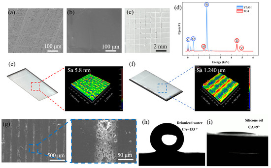 - In comparison to TC4, the STASL demonstrated superior sliding performance across a range of droplet types. At an inclination angle of 25° and a droplet volume of 25.4 μL, the sliding speed of a NaCl solution on the STASL was 2.38 cm/s, while at the same time, 36.4 μL of deionized water remained stationary on the TC4 surface.