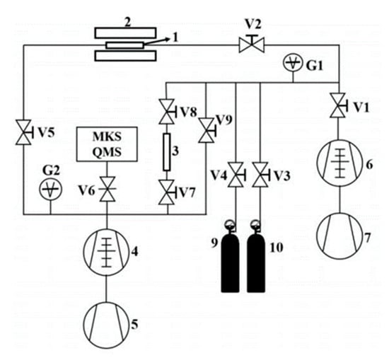 Schematic diagram of deuterium permeation testing system: 1—sample, 2—furnace, 3—standard leak, 4—ultra-high vacuum system, 5—mechanical pump, 6—high vacuum system, 7—mechanical pump, 9~10—gas cylinder, V1~9—valves.