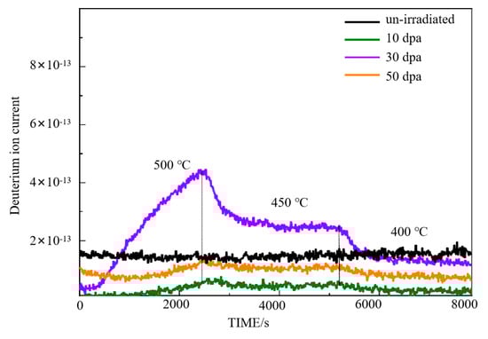 Figure 3 shows the deuterium permeation test curves of Cr2O3/Al2O3 composite coating after 10 dpa, 30 dpa, and 50 dpa irradiation. The test conditions are the same as those of the unirradiated samples. As seen in the figure, the deuterium permeation signal of the Cr2O3/Al2O3 composite coating increases initially and then decreases with the increase in irradiation damage. The deuterium permeation signal of the Cr2O3/Al2O3 composite coating at 10 dpa and 50 dpa of irradiation damage is lower than that of the unirradiated samples, and the change in the deuterium permeation signal is not significant as the temperature decreases. The deuterium permeation signal of the composite coating with 30 dpa of irradiation damage is significantly higher than that of the unirradiated samples at 500 °C, and decreases with the reduction in test temperature, becoming similar to the irradiated samples at 400 °C.