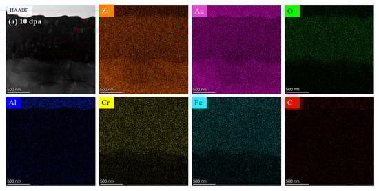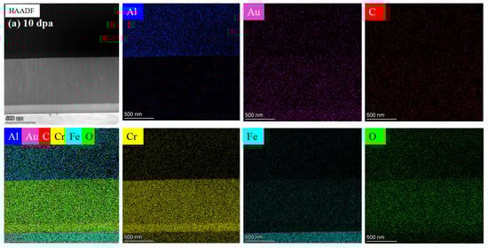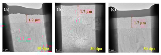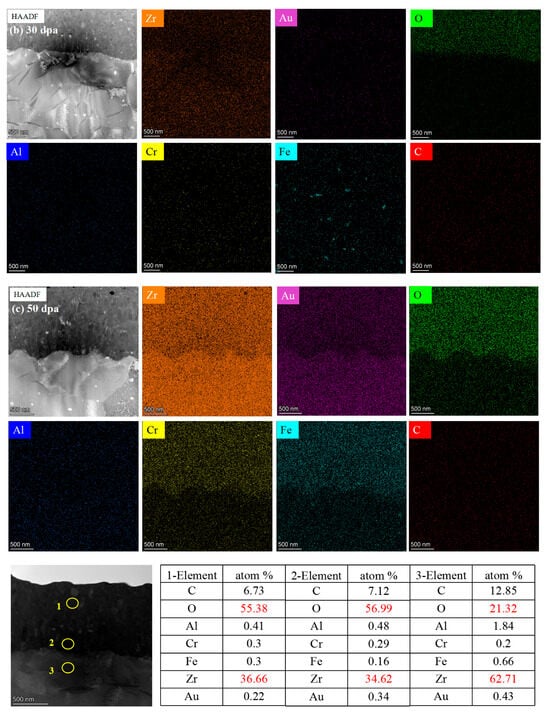 Using FIB, the cross-section of the Cr2O3/Al2O3 composite coating was obtained, as shown in Figure 4a–c, which display the cross-sectional microstructure of the Cr2O3/Al2O3 composite coating. The Cr2O3/Al2O3 composite oxide layer exhibits good adhesion, with a uniform structural distribution within a certain depth range (~1.5 μm) on the surface layer. The composite coating is ~1.5 μm thick, with two interfacial structures: one between the substrate and Cr2O3 and the other between Cr2O3 and Al2O3. Under all three irradiation conditions (10 dpa, 30 dpa, and 50 dpa), crystal grain swelling was observed within the outer Al2O3 coating, with the grain size increasing progressively with higher irradiation doses. Additionally, void formation was observed at the Al2O3/Cr2O3 interface. The number of voids increased by more than 35.4% from 10 dpa to 50 dpa, with the average void volume increasing from 4.35 × 10−7 μm3 to 8.24 × 10−5 μm3. The growth and coalescence of these voids contributed to an increase in interfacial roughness and potential weakening of the interface between the Al2O3 and Cr2O3 layers.