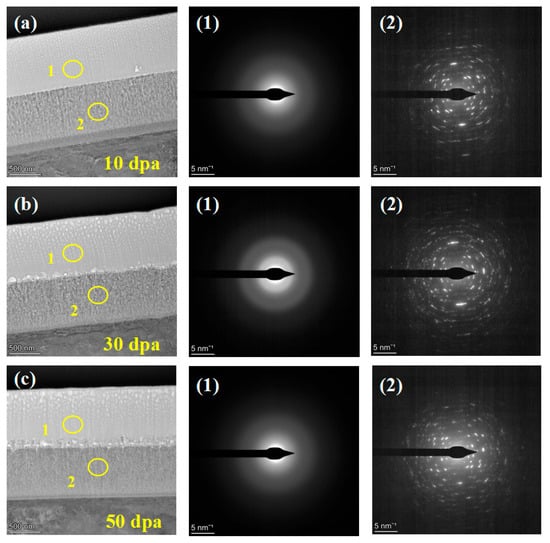 TEM cross-section image of irradiated coating and corresponding selected-area EDP: (a) 10 dpa, (b) 30 dpa and (c) 50 dpa.