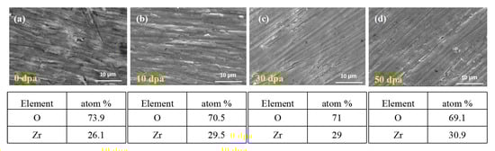 Surface SEM of pre-oxidation layer: (a) 0 dpa, (b) 10 dpa, (c) 30 dpa, and (d) 50 dpa.
