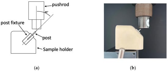 Mechanical testing was carried out using a tensile testing machine with a maximum force range of 10 kN (Autograph AGS-X Series, Shimadzu, Kyōto, Japan). The sample extended 5 mm from a custom-made metal fixture and was clamped at an angle of 45° (Figure 1a) to the post axis in the testing machine (Figure 1b).