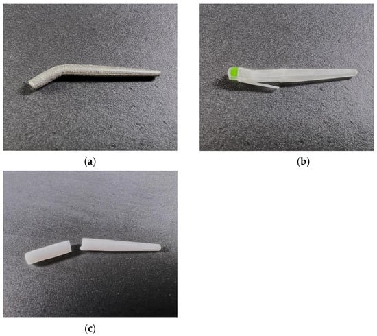 Samples (posts) after test at 45°: (a) cobalt–chromium alloy, (b) quartz fiber-reinforced composite, (c) zirconium oxide.