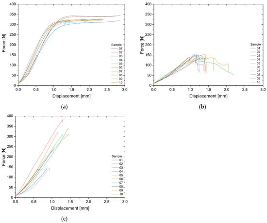 Force–displacement curves depicting group characteristics. (a) 10 cobalt–chromium posts, (b) 10 quartz fiber posts, (c) 10 zirconium oxide posts.
