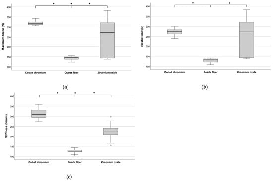 Box plots of tensile testing results. (a) Maximum force, (b) elastic limit, (c) stiffness. Statistically significant results marked with asterisk (*) (n = 10, p < 0.001).