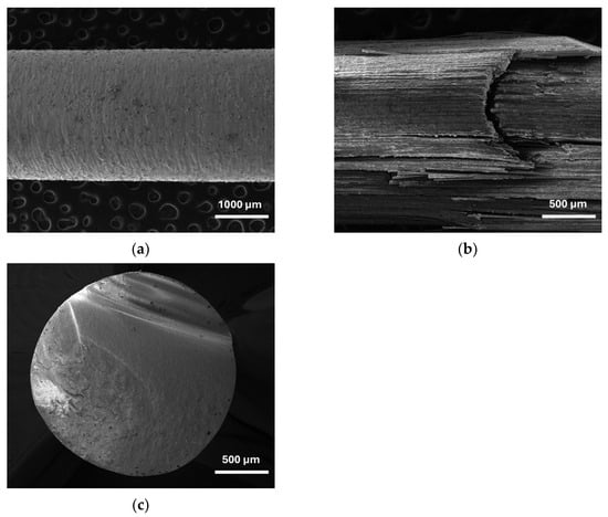 Figure 5 shows the SEM images of the surfaces of the metal and quartz fiber posts, as well as the fracture surface of the zirconium oxide post. The additively manufactured cobalt–chromium alloy exhibited a crack-free surface with visible printing layers at maximum deflection (Figure 5a), while the quartz fiber posts exhibited mixed damage under the same testing conditions, with observable micro-cracks in the matrix, delamination/debonding, and fiber rupture (Figure 5b). These observations in the quartz fiber posts agree with comparable SEM investigations carried out in three-point tested samples [18]. The zirconium oxide posts demonstrated a clean fracture surface with a homogeneous material structure, free from any porosities (Figure 5c).
