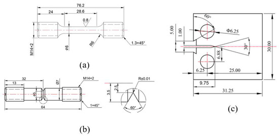 Dimensions of the test specimens: (a) tensile test; (b) notched fatigue life test; (c) fatigue crack growth rate test.