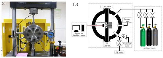 Schematic diagram of fatigue test equipment. (a) Instron fatigue testing machine; (b) experimental system schematic diagram.