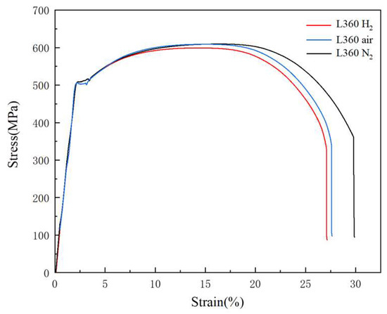 Stress–strain curves of L360 pipeline steel tensile specimens in hydrogen and nitrogen environments.