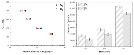The S-N curves for the notched fatigue life test performed are shown in Figure 4. With decreasing stress loads, the fatigue life of notched specimens in the hydrogen environment was about 64%, 76%, and 83% of that in the nitrogen environment. The effect of hydrogen on the fatigue life decreases with the decrease in stress.