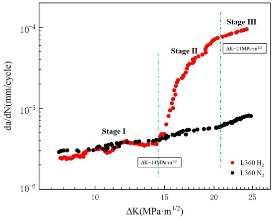 FCGR curves of L360 pipeline steel in 6 MPa hydrogen and nitrogen environments.
