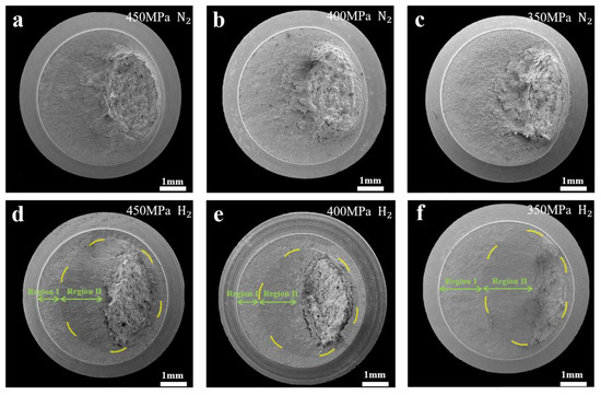 Figure 6 shows the fracture morphology of notched fatigue specimens under different stress conditions in hydrogen and nitrogen environments. Figure 6a–c show the fracture morphology under different stress loading conditions in the nitrogen environment; Figure 6d–f show the fracture morphology under different stress loading conditions in the hydrogen environment. It can be observed that there are two distinctly different regions of the L360 fracture specimens in the hydrogen environment, which are divided into Region I and Region II. It can be noticed that Region I increases gradually with the decrease in stress. The fracture morphology under the highest and lowest applied stress loads is subsequently analyzed.