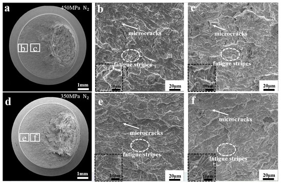 Figure 7 shows the fracture morphology of notched specimens stressed in the nitrogen environment. There are a large number of fatigue stripes and microcracks in the specimens in the nitrogen environment. As the fatigue cycle progresses, the number of fatigue stripes in the direction of fatigue crack extension in the specimens increases, as shown in Figure 7c,f. Moreover, as the stress decreases, there are fewer microcracks and more fatigue stripes in the fracture, as shown in Figure 7e,f.