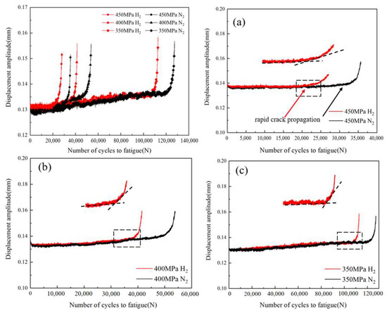 The characterization of fracture morphology can be shown in that there are distinctly different regions in the hydrogen environment, as shown in Figure 6d–f. The obvious transformation of the morphology in Region I and Region II is consistent with the change of fatigue crack growth rate in the hydrogen environment. The curves of Figure 9, displacement amplitude versus the number of cycles, illustrates that during the fatigue life cycles there exists a stage of rapid crack expansion, which is accelerated by the presence of hydrogen. The point of rapid crack initiation is determined by the intersection of two lines, one line is almost horizontal due to fatigue crack initiation and expansion, and the other line has a large change in slope due to rapid expansion of fatigue cracks, which is illustrated in Figure 9a–c. Birenis et al. [28] studied the fatigue crack growth behavior at the crack tip of pure iron and concluded that the beginning of stage II was the quasi-cleavage fracture. There is a close correlation between the formation of quasi-cleavage surface features and the acceleration of the fatigue crack growth rate in hydrogen, which indicates that hydrogen has a significant enhancement effect on the fatigue crack growth rate, which is one of the reasons for the reduction of the fatigue life in the hydrogen environment.