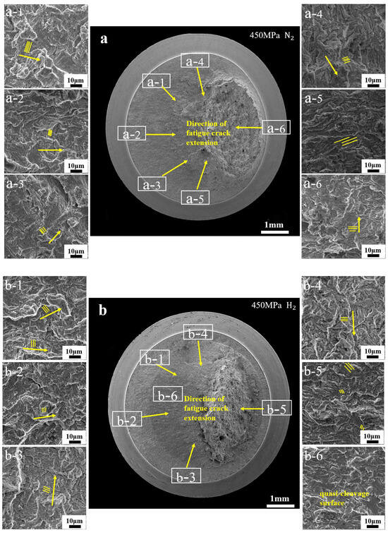 Fatigue life test under 450 MPa stress: (a) in a nitrogen environment; and (b) in a hydrogen environment. (a-1)–(a-6) are the enlarged fracture diagrams after fatigue life test under nitrogen; (b-1)–(b-6) are the enlarged fracture diagrams after fatigue life test under hydrogen.