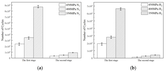 Fatigue life consumed at various stages under different stress amplitude conditions in hydrogen and nitrogen environments: (a) nitrogen environment, (b) hydrogen environment.