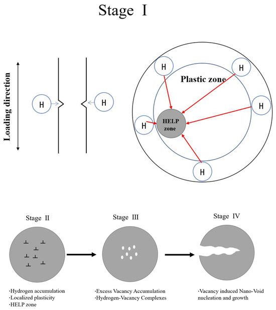 Neeraj et al. [30] proposed a mechanism based on hydrogen accumulation leading to local plastic deformation, hydrogen vacancy damage, and induced hydrogen embrittlement by observing ferritic steels’ hydrogen embrittlement fracture characteristics, as shown in Figure 12. The present study is also based on this mechanism, proposing that the hydrogen-assisted fatigue process ultimately affects fatigue life through these four stages. Since the specimens are notched, there are stress concentrations at the notch. When loading in Stage I, the material cracks at the notch and generates plastic dislocations (Stage II). However, in the presence of hydrogen, hydrogen will accumulate and build up from the environment towards the high stress at the notch, forming a region that favors plastic deformation, the region defined by Neeraj et al. [30] as the HELP region. In stage III, as the fatigue test proceeds, superfluous vacancies will be formed, which accumulate in large numbers in the HELP region, and these vacancies will combine with hydrogen, eventually forming nucleation and growth of nano-gaps in stage IV, leading to crack generation. An et al. [31] investigated the ease of crack formation and extension at the notch under different horizontal stress concentration conditions. In this study, the effect of stress magnitude on the HELP region at the notch was investigated in the direction of stress conditions and at the same stress level, and it was found that the effect of hydrogen on this region was different. Since most of the fatigue fracture process is concentrated in the vacancies formed in the third stage, two distinct regions are found at the fracture. The transition from the third to the fourth stage is the stage of rapid growth of the displacement amplitude Da value in Figure 11. However, the number of fatigue cycles with rapidly increasing values of displacement amplitude Da in the hydrogen environment approaches the specimens in the nitrogen environment with decreasing stress, which indicates that the effect of hydrogen on the rapid expansion of cracks at notches decreases with decreasing stresses. Zeng et al. [32] investigated the effect of a hydrogen environment on the fatigue fracture morphology of X80 pipeline steel. Combined with SEM analysis of the fracture morphology, the decrease in the size and density of the tough nests decreased the displacement amplitude, while the increase in the plane area increased the displacement at fatigue fracture due to the accelerated crack extension. M.A. Mohtadi-Bonab [33] investigated the effect of different parameters on hydrogen-induced fatigue failure of pipeline steels and found that the effect of hydrogen on the rate of fatigue crack extension is more pronounced because hydrogen atoms migrate to the crack tip at low frequencies. Fatigue crack extension accelerates with increasing hydrogen pressure, and its extension is minimum when tested in air. Li et al. [34] established a CPFEM model based on the principles of crystal plasticity theory and proposed a fatigue life prediction model for pre-charged hydrogen austenitic stainless steel. The model successfully predicted the fatigue life under different hydrogen contents and stress amplitudes, and the predicted fatigue life was well fitted to the S-N curve within two times error.