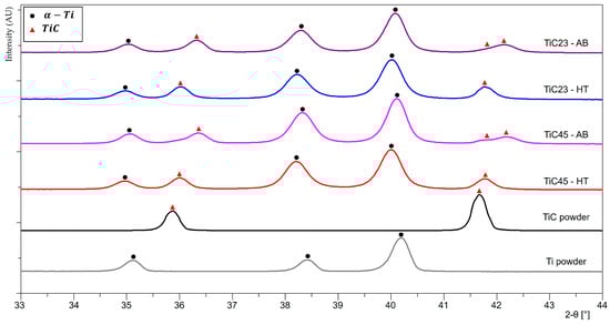 - Andrieux, J.; Gardiola, B.; Dezellus, O. Synthesis of Ti matrix composites reinforced with TiC particles: In situ synchrotron X-Ray diffraction and modeling. J. Mater. Sci. 2018, 53, 9533–9544. [Google Scholar] [CrossRef]