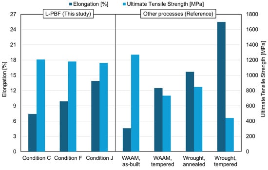 3.3.3. Comparison of Mechanical Properties of Type 410 Stainless Steel Produced by L-PBF in As-Built Condition and Other Processes
