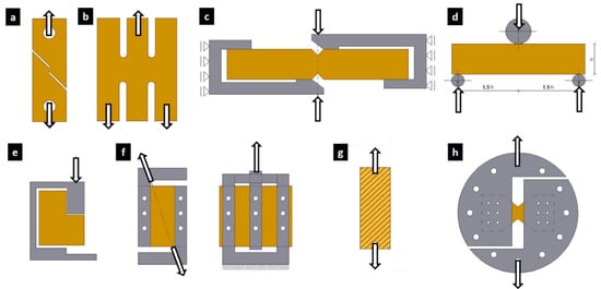 Specimen geometries for shear testing under different loads (arrows): (a) ASTM B831 standard [39,47], (b) Miyauchi [46], (c) Iosipescu [48], (d) short flexural beam, (e) block type (ASTM D143 [49]; ASTM D905 [50]; ASTM D1037 [35]), (f) two- and three-rail device [35], (g) ASTM D3518 (45° off-axis tensile) [51,52], and (h) Arcan fixture [53,54,55].