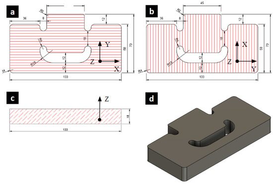 Figure 3 shows the geometry of the shear test samples in the τxy and τyx directions. The samples, modified from the Miyauchi shear test (Figure 1b), had dimensions of 133 mm × 70 mm in length, with a double test zone of 18 mm × 18 mm. The shear samples featured increased cross-sectional areas in their three pillars to avoid combined stresses in the shear zone.