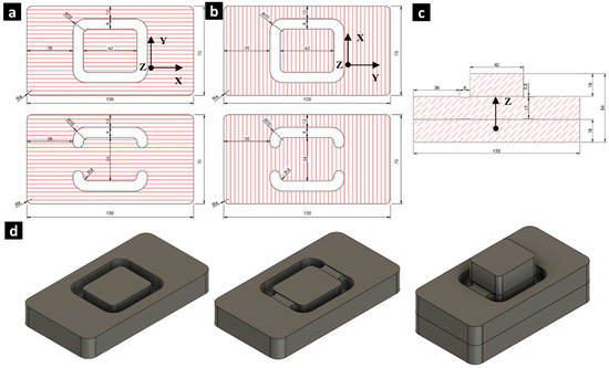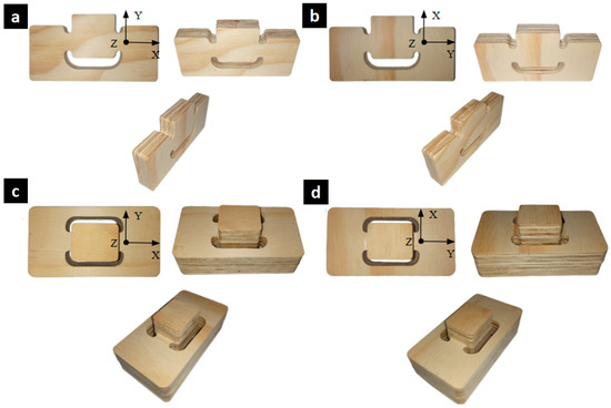 Figure 4a,b details the geometry of the shear test samples for the shear stress directions τxz and τyz, respectively. The specimen geometry consisted of three elements bonded with wood adhesive to prevent slippage or human error during the handling and installation of the samples in the testing machine. The test area included a uniform 8 mm wide and 0.5 mm deep notch to facilitate shear failure in the studied zone. The test area mirrors the geometry of the τxy and τyx shear samples, where, in this case, a normal and uniform force is applied to the top face of the section with dimensions of 42 mm × 34 mm or the upper block detailed in Figure 4c,d.