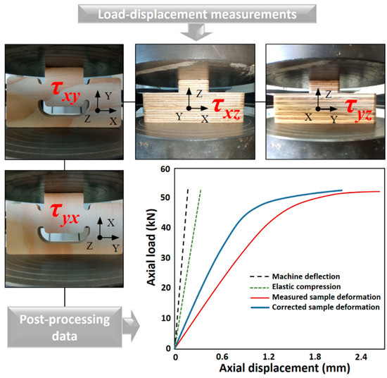 Mounting of the manufactured shear samples on a universal testing machine with compression plates in the τxy, τyx, τxz, and τyz directions.
