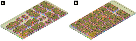 The toolpaths for manufacturing via a CNC router, along with the positioning and orientation of the samples on the plywood boards, were carefully considered to optimize material usage and minimize waste during the manufacturing process. Figure 6a shows the toolpath for the samples characterizing Sxy and Syx shear strength, arranged to efficiently utilize the available board space. Figure 6b shows the toolpath used for the Sxz and Syz testing, which involves the optimization of the tool movements and sequences to achieve the fastest possible fabrication times while maintaining the required geometric accuracy. A ¼′′ diameter flat-end mill for wood applications was used with the following manufacturing parameters: spindle speed of 5000 rpm, cutting feed rate of 2400 mm/min, ramp feed rate of 800 mm/min, and a maximum cutting depth of 4 mm. These toolpath optimizations were crucial steps to ensure the accurate and repeatable manufacture of the miniaturized shear test samples across the various orthotropic directions of the plywood panels.