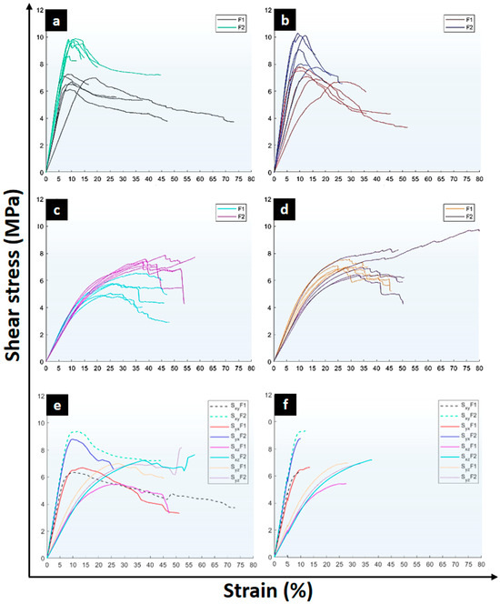 Shear stress–strain curves of plywood of investigated samples F1 and F2: (a) τxy, (b) τyx, (c) τxz and, (d) τyz, (e) average curves of the damage zone and, (f) average curves until the maximum shear stress.