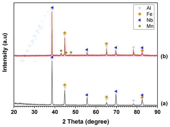 XRD patterns of starting mixture powders of (a) Al–Fe–Nb and (b) Al–Fe–Nb–Mn.