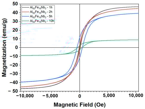 Hysteresis curves of Al82Fe16Nb2 powders milled for different milling times.