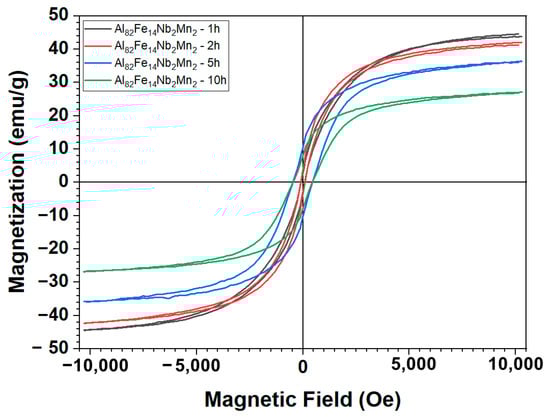 Figure 6 and Figure 7, respectively, present the hysteresis magnetic curves of Al82Fe16Nb2 and Al82Fe14Nb2Mn2 alloys milled at 350 rpm for 1 h, 2 h, 5 h, and 10 h. Here, all curves are sigmoidal in shape, indicating incomplete saturation at external fields as high as 10,000 Oe. The values of saturated magnetization (Ms) and magnetic resistance (Hc) for alloys Al82Fe16Nb2 and Al82Fe14Nb2Mn2 with different milling times are listed in Table 3. For the Al82Fe16Nb2 powder, after milling for 1 h, the Ms value was about 47.60 emu/g and decreased to 9.21 emu/g after 10 h of milling. This decrease in the Ms values of powders after milling was due to changes in the chemical composition, the local environment of the magnetic atoms, and the electronic structure of the materials, as reported by Xu et al. []. As noted by Oanh et al., the formation of an amorphous phase tends to reduce the Ms value []. Moreover, a reasonably low Ms value of about 0.8 emu/g was obtained for the Al82Fe14Ni2Y2 alloy. Replacing 2 at.% Mn with Fe in Al82Fe16Nb2 strengthens the electronic interaction of Fe–Mn compared to that of Fe–Fe. Therefore, the Ms value of of the final product of the Al82Fe14Nb2Mn2 alloy was higher than that of the Al82Fe16Nb2 alloy. In contrast to the decrease in the value of Ms, with an increase in milling time, the Hc values of the Al82Fe16Nb2 and Al82Fe14Nb2Mn2 alloy powders increased. By increasing the milling time from 1 to 10 h, the Hc of the Al82Fe16Nb2 alloy increased from 23.94 to 383.79 Oe, while the Hc of the Al82Fe14Nb2Mn2 alloy increased from 86.5 to 456 Oe. The increase in Hc during milling is attributable to the use of high-energy milling, which produces a high deviation density and residual stress in the milling powder [,,,]. For the Al82Fe16Nb2 alloy system, when the milling time is increased from 5 h to 10 h, the magnetic resistance decreases from 474.65 to 383.79 Oe due to a reduction in the particle size and an increase in the proportion of the amorphous phase. However, for the Al82Fe14Nb2Mn2 alloy after milling for 5 h to 10 h, the Hc value remained unchanged at 456 Oe. Overall, the Al82Fe16Nb2 and Al82Fe14Nb2Mn2 alloys have soft magnetic properties at lower milling times (from 1 h to 5 h) and hard magnetic properties when forming amorphous phases (5 h and 10 h milling).