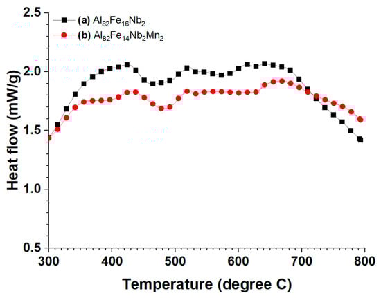 Figure 8 presents the DSC curves of the Al82Fe16Nb2 and Al82Fe14Nb2Mn2 alloys after 10 h of milling. Here, there are exothermic peaks in the temperature range of 300–800 °C. The substitution of 2 at.% Mn for Fe leads to similarities between the two alloys in terms of shape and the onset crystallization temperature (Table 4). As Kuen-Shan Jaw [] reported, stearic acid decomposes significantly in a temperature range of 320–480 °C.