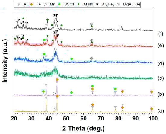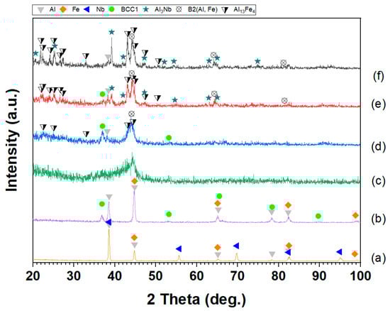 XRD patterns for Al82Fe16Nb2: (a) a mixture of powders (Al, Fe, and Nb); powders milled for (b) 2 h and (c) 10 h, followed by heat treatment for 15 min at (d) 550 °C, (e) 600 °C, and (f) 700 °C.