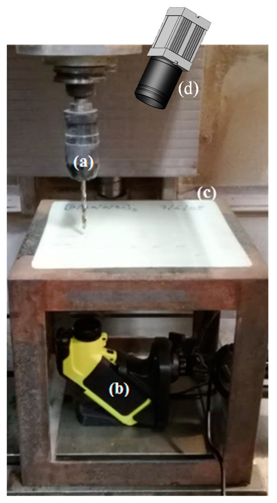 Experimental apparatus: (a) drilling tool; (b) lower thermographic camera; (c) plate; (d) upper thermographic camera.
